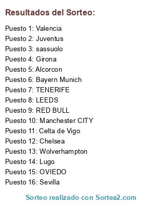 Lista de participantes: OVIEDO, TENERIFE, Chelsea, Bayern Munich, Girona, Celta de Vigo, Alcorcon, Sevilla, Lugo, sassuolo, LEEDS, Manchester CITY, Valencia, Wolverhampton, Juventus, RED BULL.