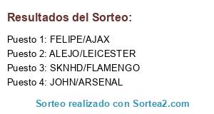 Lista de participantes: FELIPE/AJAX, JOHN/ARSENAL, SKNHD/FLAMENGO, ALEJO/LEICESTER.