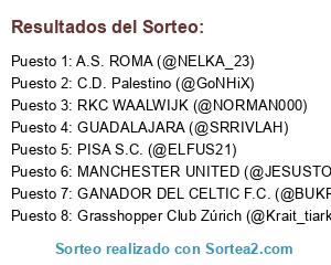 Lista de participantes: GUADALAJARA (@SRRIVLAH), A.S. ROMA (@NELKA_23), RKC WAALWIJK (@NORMAN000), GANADOR DEL CELTIC F.C. (@BUKRON00) VS RCD ESPANYOL (@PESADILLA21181), MANCHESTER UNITED (@JESUSTORRESS), PISA S.C. (@ELFUS21), Grasshopper Club Zúrich (@Krait_tiark), C.D. Palestino (@GoNHiX).