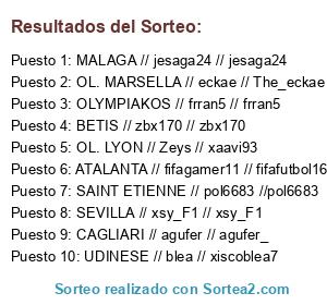 Lista de participantes: UDINESE // blea // xiscoblea7, BETIS // zbx170 // zbx170, MALAGA // jesaga24 // jesaga24, SEVILLA // xsy_F1 // xsy_F1, OL. LYON // Zeys // xaavi93, SAINT ETIENNE // pol6683 //pol6683, OL. MARSELLA // eckae // The_eckae, CAGLIARI // agufer // agufer_, ATALANTA // fifagamer11 // fifafutbol16, OLYMPIAKOS // frran5 // frran5.