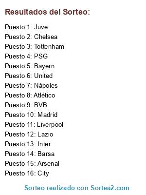 Lista de participantes: Inter, Madrid, Nápoles, BVB, Barsa, Juve, Atlético, Lazio, Bayern, City, PSG, Tottenham, Chelsea, United, Liverpool, Arsenal.
