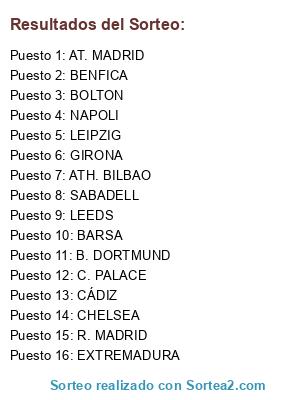 Lista de participantes: BENFICA, R. MADRID, GIRONA, LEIPZIG, CHELSEA, NAPOLI, LEEDS, EXTREMADURA, BOLTON, BARSA, AT. MADRID, ATH. BILBAO, C. PALACE, SABADELL, B. DORTMUND, CÁDIZ.