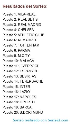 Lista de participantes: CHELSEA, LAZIO, INTER, REAL BETIS, FENERBACHE, NAPOLES, TOTTENHAM, PARMA, BARÇA, AT.MADRID, LIVERPOOL, B.DORTMUND, BESIKTAS, ESPANYOL, REAL MADRID, ATHLETIC CLUB, OPORTO, M.CITY, MALAGA, VILA-REAL.