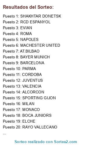 Lista de participantes: SPORTING GIJON, MONACO, JUVENTUS, NAPOLES, BARCELONA, PARMA, RCD ESPANYOL, MILAN, ELCHE, REAL MADRID, MACHESTER UNITED, EVIAN, AT.BILBAO, BOCA JUNIORS, BAYER MUNICH, ALCORCON, ROMA, TORINO, VALENCIA, RAYO VALLECANO, RECREATIVO HUELVA, SHAKHTAR DONETSK, B.GUAYAQUIL, CORDOBA.