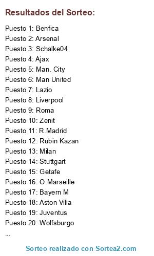Lista de participantes: Man United, Liverpool, Benfica, Stuttgart, Roma, Wolfsburgo, Galatasaray, Arsenal, Man. City, Milan, Athletic Club, Inter, Getafe, Juventus, Valencia, Zenit, Lazio, Sampdoria, Oporto, Rubin Kazan, Fiorentina, R.Madrid, Sevilla, Ajax, Schalke04, O.Lyon, Tottenham, Aston Villa, Bayern M, O.Marseille, At. Madrid, W. Bremen.