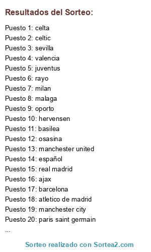 Lista de participantes: valencia, hervensen, flamengo, real madrid, barcelona, sevilla, manchester city, español, malaga, inter de milan, levante, paris saint germain, juventus, ajax, bayern, osasina, celta, rayo, oporto, basilea, manchester united, celtic, milan, atletico de madrid.