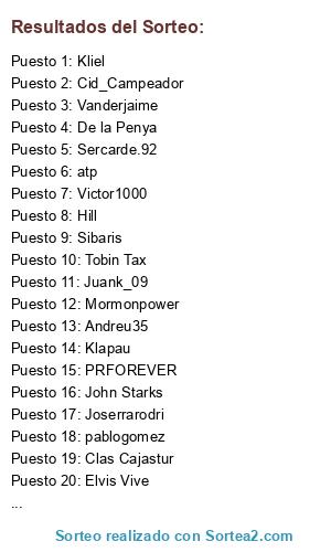 Lista de participantes: Phosk, Jmprefasi93, Vanderjaime, Karrillo, PabloD_Pavel, Winchester, Marhiased, Amitx, pablogomez, PRFOREVER, Mateops19, CIUDI, CesarG, Emihc, Fly, La Jefa, De la Penya, Yorko, Javierporfavor, Davidmugue, RubenRtx, MartensitaRevenida, Advenedizo, Peña kikilias, FGuardiaP, Srwanwan, AlexGP, atp, Banco di Malaga, Galba, AntonioJesus_Huelin, Markelfdz_, Sibaris, Ismogo, Luigi, Nasito10, Botijito, Luis-donosti, Ganon, Hill, JMazo, Eastway, Danazik, Dani_cj, Josu93, jcrubiales, Adri_MaD, Fernanpopi, Juan Carlos Vasquez, Kliel, Joserrarodri, Erpakobasket, padovan0, Monroe Bell, SC30KT11, Victor1000, IBM, Caneloff, JOSEDIN, Oso Pinoso, Elvis Vive, MarioArias95, Klapau, Wggomezvpalf, Asacan, Lpi, Touche Amore, Feringucho, Shinchan, Adriel, DeliriumTremens, Pingudaa, Sara Joel Nil, Sercarde.92, Gomez99, Dave Batista, Mormonpower, Paches19, Balaverde19, Yuberostar, Ricard_mv, Surimi, FURGEN, Clas Cajastur, Calvin_k15, Aldebaran, A:BEA, Jaimeguada, Jose fc, Catacroc, Alfrdjcuak, Canabet, Pepet76, Peli, Cid_Campeador, Yugo Uds, GalleGonco, Acaballero, Jorgemtnez, Jacob., Sauber, Dakar, Laturn, Ratamugre, Amc81granada, Juank_09, Ricard27, Wapimach Bike, Ivan Zamorano, Alsvinn, Omar Little, Pera Mayor, Orkatz96, walter, Arranz, Purito_jr, John Starks, chekos, Carolo, DaMaCre, Esplu, Alvarol, Tobin Tax, Andreu35, TXIN, Pacojobacho.
