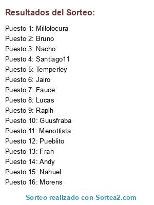 Lista de participantes: Jairo, Lucas, Andy, Nacho, Fran, Pueblito, Nahuel, Bruno, Fauce, Morens, Menottista, Guusfraba, Raplh, Temperley, Millolocura, Santiago11.