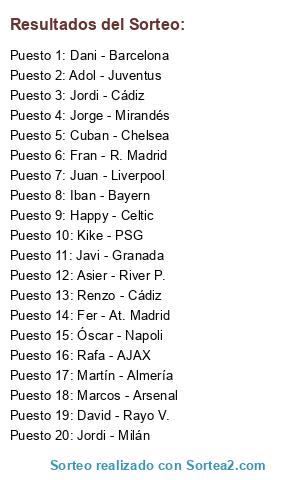 Lista de participantes: Martín - Almería, David - Rayo V., Happy - Celtic, Jordi - Milán, Marcos - Arsenal, Cuban - Chelsea, Jorge - Mirandés, Kike - PSG, Jordi - Cádiz, Rafa - AJAX, Dani - Barcelona, Javi - Granada, Iban - Bayern, Óscar - Napoli, Renzo - Cádiz, Fer - At. Madrid, Adol - Juventus, Fran - R. Madrid, Asier - River P., Juan - Liverpool.