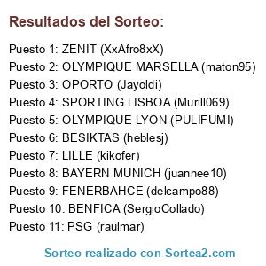 Lista de participantes: BAYERN MUNICH (juannee10), OPORTO (Jayoldi), OLYMPIQUE MARSELLA (maton95), PSG (raulmar), OLYMPIQUE LYON (PULIFUMI), SPORTING LISBOA (Murill069), FENERBAHCE (delcampo88), BESIKTAS (heblesj), LILLE (kikofer), BENFICA (SergioCollado), ZENIT (XxAfro8xX).