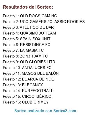 Lista de participantes: QUASIMODO TEAM, CIRCO IBÉRICO, CLUB GRIMEY, ATLÉTICO DE BAR, MAGOS DEL BALÓN, LA MASIA FC, ZON3 T3AM FC, PUREFOOTBALL, ELEGANCY, RESIST4NCE FC, SPAIN FOX UNIT, OLD DOGS GAMING, EL ARCA DE NOE, ANDALUCES FC, OLD GLORIES UTD, UCO GAMERS / CLASSIC ROOKIES.