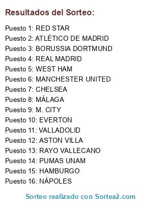 Lista de participantes: MANCHESTER UNITED, VALLADOLID, CHELSEA, RAYO VALLECANO, REAL MADRID, BORUSSIA DORTMUND, PUMAS UNAM, RED STAR, EVERTON, HAMBURGO, ATLÉTICO DE MADRID, WEST HAM, ASTON VILLA, M. CITY, NÁPOLES, MÁLAGA.