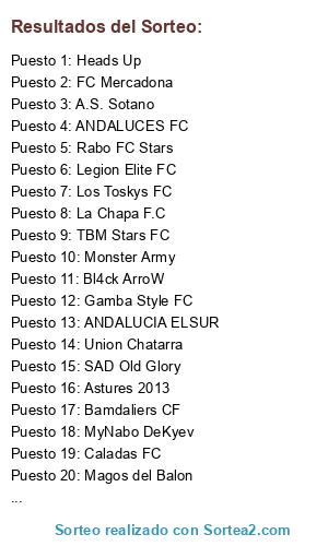 Lista de participantes: Rabo FC Stars, Heads Up, Bamdaliers CF, Magos del Balon, Los Toskys FC, La Chapa F.C, EL ARCA DE NOE CF, Legion Elite FC, SAD Old Glory, Monster Army, Gamba Style FC, MyNabo DeKyev, Astures 2013, Bl4ck ArroW, FC Mercadona, Caladas FC, ANDALUCES FC, A.S. Sotano, ANDALUCIA ELSUR, TBM Stars FC, Union Chatarra.