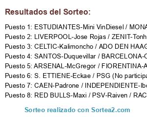 Lista de participantes: RED BULLS-Maxi / PSV-Raiven / RACING CLUB-Tabascos / FLAMENGO-Ferminnn, S. ETTIENE-Eckae / PSG (No participa) / AC MILAN-Amonosparexxx / GUANZHOU-Lucamontana, SANTOS-Duquevillar / BARCELONA-Oskarkawa / AJAX-Luizao / MONTPELLIER-Betico, CAEN-Padrone / INDEPENDIENTE-Iborra / PARMA-Antonio / ROMA-Angel el grande, CELTIC-Kalimoncho / ADO DEN HAAG-Pepelu / B. LEVERKUSEN-Sullendonkey / LAZIO-Magic King, ESTUDIANTES-Mini VinDiesel / MONACO-Sego / OL. LYON- ByDavid180 / OPORTO-Nachoeme, LIVERPOOL-Jose Rojas / ZENIT-Tonho / GALATASARAY-Capelinho / RED STAR-Pabloski, ARSENAL-McGregor / FIORENTINA-Arteroman / OL. MARSELLA-Marcos / INTER DE MILAN-Ru Cortes.