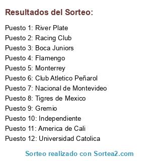 Lista de participantes: River Plate, Boca Juniors, Racing Club, Independiente, Nacional de Montevideo, Club Atletico Peñarol, Flamengo, Gremio, America de Cali, Universidad Catolica, Monterrey, Tigres de Mexico.