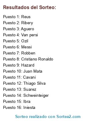 Lista de participantes: Messi, Cristiano Ronaldo, Ibra, Suarez, Ozil, Ribery, Van persi, Iniesta, Hazard, Thiago Silva, Aguero, Schweinteiger, Reus, Robben, Cavani, Juan Mata.