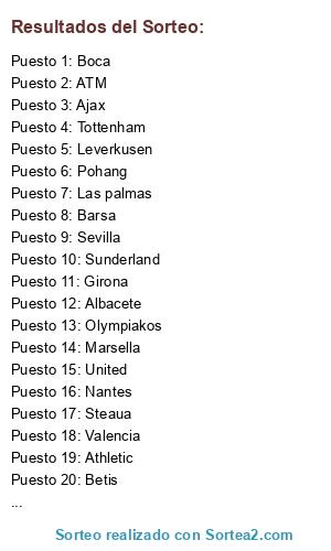 Lista de participantes: Racing, United, Sevilla, Marsella, Ajax, Boca, Albacete, Napoles, Betis, Arsenal, Olympiakos, Las palmas, Panathinaikos, Steaua, Valencia, ATM, Sunderland, Barsa, Nantes, Athletic, Pohang, Tottenham, Leverkusen, Girona.