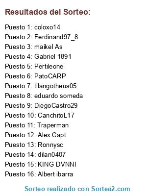 Lista de participantes: tilangotheus05, Ferdinand97_8, Alex Capt, PatoCARP, Albert ibarra, Ronnysc, KING DVNNI, dilan0407, DiegoCastro29, CanchitoL17, Gabriel 1891, maikel As, eduardo someda, coloxo14, Traperman, Pertileone.