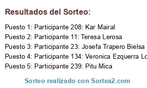 Lista de participantes: Participante 1: Inma Agulló, Participante 2: Txaro García, Participante 3: Alizia Sanz Miñana, Participante 4: Encarnita Monzó, Participante 5: Bertha Jeanette YTomas, Participante 6: Carmen Lopez Ezquerro, Participante 7: Vanesa Tomás Julián, Participante 8: Amparo Pinilla, Participante 9: Evacris Nieto Espejo, Participante 10: Aurora Fuentes, Participante 11: Teresa Lerosa, Participante 12: Cristina A Soria, Participante 13: Sandra Usieto, Participante 14: Nines Fuertes, Participante 15: Andrea Galan, Participante 16: Yeni Perez Molina, Participante 17: Marta Val Salvatierra, Participante 18: Luz Blasco, Participante 19: Loli Paton, Participante 20: Carol Aragon Razquin, Participante 21: Raquel Artigas Puértolas, Participante 22: Maria Jose Clavero Lopez, Participante 23: Josefa Trapero Bielsa, Participante 24: Pilar Malo Valenzuela, Participante 25: Elena Torrecilla Alcubierre, Participante 26: Susana Qui Gonzalez, Participante 27: Gemma Hernandez Gil, Participante 28: Paqui Anguis, Participante 29: Tere Teresa Teresa, Participante 30: Maria Pilar, Participante 31: Sandra Navarro Sanchez, Participante 32: Belinda Marugan, Participante 33: Peny Posa De Azúcar, Participante 34: Rosa Maria Arnau Parra, Participante 35: Beatriz Pintane Argachal, Participante 36: Vito Sofin Mendivil, Participante 37: Pura Marcen, Participante 38: Ana Clavero, Participante 39: Luz Del Mar Sanchez, Participante 40: Sonia Jaraba Lapetra, Participante 41: Nathalie Llaima Perez, Participante 42: Yolanda Alba Valle, Participante 43: Susana Lopez Trigo, Participante 44: Ruth Santamarta, Participante 45: Patchwork Carmen, Participante 46: Sandra Bailo, Participante 47: Cristina Arcos, Participante 48: Luz Magallón, Participante 49: Ester Paricio, Participante 50: Isa DiLo, Participante 51: Beatriz Vicente Gimeno, Participante 52: Elena Echenique, Participante 53: Conchi Andrés, Participante 54: Vicky Jario, Participante 55: Asiul Prince, Participante 56: Montserrat Andres Orea, Participante 57: Mónica Gómez Bosque, Participante 58: Susana Lechon, Participante 59: DreamsSugar Evitazgz, Participante 60: Inmaculada Palomares, Participante 61: Pilar-in Sanz, Participante 62: Charo Giral Romero, Participante 63: Montse Palacian, Participante 64: Lola Royo Marin, Participante 65: Lorena PD, Participante 66: Begoña Campa Nilla, Participante 67: Giselle Carolina Bilbao Medina, Participante 68: Lola Domínguez, Participante 69: Maria Angeles Benito Artigas, Participante 70: Elma Mansilla, Participante 71: Silvia van Bergin, Participante 72: Almudena Pitarch, Participante 73: Dulce Maria, Participante 74: Silvia Aznar Bes, Participante 75: Ana Cristina Garcia Gonzalez, Participante 76: Carmen Santos Fara, Participante 77: Laura Ros, Participante 78: Eva Maria Barcelona Embid, Participante 79: Cristina Ledesma Garcia, Participante 80: Anabel Anabel, Participante 81: Marivi Gil Perales, Participante 82: Olga Trenc, Participante 83: Beatriz Gascón Escuín, Participante 84: Teresa Esther Mongay Miyukadas, Participante 85: Eli Hernández Soriano, Participante 86: Alba Mombiela Sanchez, Participante 87: Puri Martínez, Participante 88: Isabel Lamana Barat, Participante 89: Patricia Marin, Participante 90: Rosa Esteban Oroz, Participante 91: Viky Ta Loswebs, Participante 92: Pilar Velilla Sanchez, Participante 93: Estibaliz Eraso Gallart, Participante 94: Begoña Pérez, Participante 95: Josephine Gil Sanz, Participante 96: Mercedes Sánchez García, Participante 97: Belén Aparicio Lozano, Participante 98: María Martínez Aured, Participante 99: Conchita Romeo Flores, Participante 100: Mari Carmen Puertas Carrera, Participante 101: Silvia Lopez Garcia, Participante 102: Esmeralda Recio de Cia, Participante 103: Amparo Villarroya, Participante 104: Voilà Zaragoza, Participante 105: Noemi Labara Ansón, Participante 106: Alba Bordetas Gascón, Participante 107: CrisCat Manualidades, Participante 108: Carmen Langarita Crespo, Participante 109: Conchi Martin, Participante 110: Asun Montañes Ardevines, Participante 111: Sofia Bonet Ruiz, Participante 112: Silvia Algarra Guerrero, Participante 113: Vicky Garcia, Participante 114: Maria Yosoy, Participante 115: Virginia Marín Gayán, Participante 116: Vane Lazaro, Participante 117: Rebeca Egea, Participante 118: Pili Pontaque García, Participante 119: Ana Lamata Brun, Participante 120: Rosa Conval, Participante 121: Ana PG, Participante 122: Esther Sánchez, Participante 123: Mar Santagertrudis Castillo, Participante 124: Yoli Bertad, Participante 125: Ana Perez, Participante 126: Beatriz Lalinde Lidon, Participante 127: Susana Fernandez, Participante 128: Ana Rocio Chueca Ramos, Participante 129: Elena AG, Participante 130: Fina PaGon, Participante 131: Carmen Guillen, Participante 132: Chusa MaVi, Participante 133: Patricia Perfecto Carcelero, Participante 134: Veronica Ezquerra Lopez, Participante 135: Nuria Nurita, Participante 136: Mercedes Braulio Alastuey, Participante 137: Pao RZ, Participante 138: Conchi Liarte Aparicio, Participante 139: Mónica González García, Participante 140: Marta Invernon, Participante 141: Roldh Roldh, Participante 142: Pepa Samitier, Participante 143: Marivi Palacio Puente, Participante 144: Nuria Gimeno Mencía, Participante 145: Nuria Oliver Mateo, Participante 146: Pilu Solàn Colazet, Participante 147: Sofia Alejaldre Villegas, Participante 148: Karmentxu Irigoyen, Participante 149: Yolanda Calvo, Participante 150: Beettel Bee, Participante 151: Ana Pueyo Egea, Participante 152: Lules NZ, Participante 153: Sonia Abiol Pascual, Participante 154: Rosa Remon Gaudes, Participante 155: Ana Robles Ortiz, Participante 156: María PH, Participante 157: Pilar Aliaga Colas, Participante 158: ElMundo DeAnika, Participante 159: Piluca Hernandez, Participante 160: Beatriz Reyes, Participante 161: Maria Jose Moros Enguita, Participante 162: Eva Fernandez Pardos, Participante 163: Susana Navarro Cabeza, Participante 16