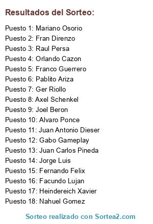 Lista de participantes: Joel Beron, Heindereich Xavier, Axel Schenkel, Orlando Cazon, Facundo Lujan, Alvaro Ponce, Jorge Luis, Pablito Ariza, Juan Antonio Dieser, Raul Persa, Fran Direnzo, Fernando Felix, Juan Carlos Pineda, Nahuel Gomez, Gabo Gameplay, Franco Guerrero, Ger Riollo, Mariano Osorio.