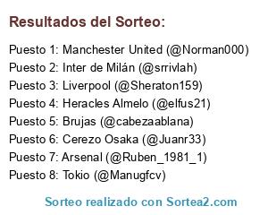 Lista de participantes: Liverpool (@Sheraton159), Tokio (@Manugfcv), Brujas (@cabezaablana), Inter de Milán (@srrivlah), Manchester United (@Norman000), Heracles Almelo (@elfus21), Cerezo Osaka (@Juanr33), Arsenal (@Ruben_1981_1).