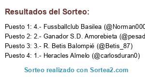 Lista de participantes: 1.- Heracles Almelo (@carlosduran0), 2.- Ganador S.D. Amorebieta (@pesadilla21181) vs Chelsea F.C. (@elfus21), 3.- R. Betis Balompié (@Betis_87), 4.- Fussballclub Basilea (@Norman000).
