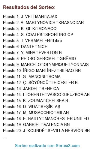 Lista de participantes: M. MUSACCHIO MILAN, IVÁN MARCANO PORTO, ÍÑIGO MARTÍNEZ BILBAO BR, S. COATES SPORTING CP, I. DIOP WEST HAM RB, A. MARTYNOVICH KRASNODAR, MARCELO OLYMPIQUE LYONNAIS, JEMERSON MONACO, K. GLIK MONACO, PEDRO GEROMEL GRÊMIO, J. VELTMAN AJAX, E. BAILLY MANCHESTER UNITED, J. MATHIEU SPORTING CP, J. KOUNDÉ SEVILLA NERVIÓN BR, G. MANCINI ROMA, LLORENTE VASCO GIPUZKOA AB, V. CUESTA INTERNACIONAL, GABRIEL VALENCIA BN, Y. MINA EVERTON B, Ç. SÖYÜNCÜ LEICESTER B, DANTE NICE, JARDEL BENFICA, D. VIDA BEŞİKTAŞ, T. MINGS ASTON RB, T. VERMAELEN Libre, A. MANDI SEVILLA TRIANA VB, K. ZOUMA CHELSEA B.