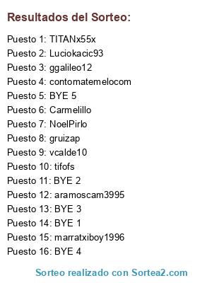 Lista de participantes: Luciokacic93, aramoscam3995, ggalileo12, TITANx55x, contomatemelocom, tifofs, marratxiboy1996, vcalde10, gruizap, Carmelillo, NoelPirlo, BYE 1, BYE 2, BYE 3, BYE 4, BYE 5.