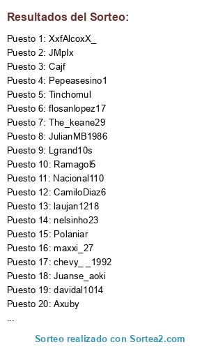 Lista de participantes: chevy_ _1992, Mariosofrv, fricknopa_fcc, camilo0512, Nacional110, X_Juankmfc_X, laujan1218, Garysnakeye, Bogotano18, DavidGutierrez2, Tinchomul, Lgrand10s, Carpal305, nelsinho23, maxxi_27, Juanse_aoki, Pepeasesino1, ElTumiPeru, stikjorJC17, Valcrist, PERUANOFORCE10, davidal1014, Botyz10, Fenomenal1993, onlysantew, Colombiannicko, Mateo_CFI, melendez_marco, Ricawoody14, FF-GERMAN, Jovanny1981, snake-075, snake-0751, Nathan_0223, peselepo, Hetchiring, DECANO_TORRES, Tu-muert3, jotalnator, Cfc_Zlatan, SergioAlbi-Rojo, matiasmarin2014, LM_Mafla_I9I, ironmaneslaond, cristhian_fistks, JAZON10FCB, Leodiaz_27, Axuby, Torettao-CFI, HND _ - Marcos - _ HND, o11ceCaldas, Lcharry79, LeanDami05, The_keane29, Ramagol5, torettoidag, XxfAlcoxX_, JavierOp915, flosanlopez17, adonko, Juanksh1133, Siiriiuus, joZeto_90, Cajf, JulianMB1986, Polaniar, CamiloDiaz6, YSIKSTBN24, JMpIx, Naluffy-D, JR-Palazzo, WillMolinag, Lokombia_27, diegoalvarez12, Andresmesa11, Unseaminghawk, Pablo_CJA, Yalexito7, Fer-Villa105, porritas.