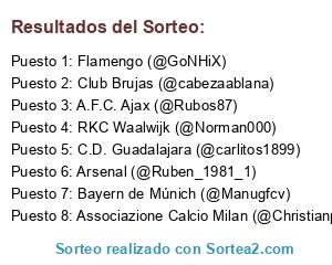 Lista de participantes: C.D. Guadalajara (@carlitos1899), Flamengo (@GoNHiX), Arsenal (@Ruben_1981_1), Associazione Calcio Milan (@Christianperez692), Bayern de Múnich (@Manugfcv), RKC Waalwijk (@Norman000), Club Brujas (@cabezaablana), A.F.C. Ajax (@Rubos87).