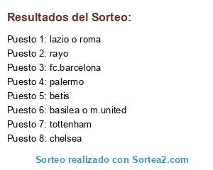 Lista de participantes: palermo, rayo, chelsea, betis, fc.barcelona, tottenham, basilea o m.united, lazio o roma.