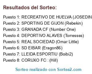 Lista de participantes: CORUXO FC (Hill), LLEIDA ESPORTIU (Boibi2), SPORTING DE GIJON (Rebekin), DEPORTIVO ALAVES (Torressss), SD EIBAR (Eragon86), GRANADA CF (Number One), RECREATIVO DE HUELVA (JOSEDIN), REAL SOCIEDAD (Omar Little).