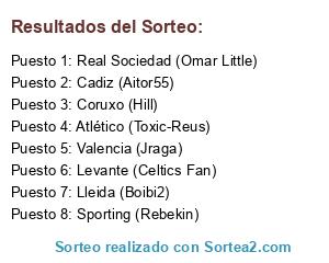 Lista de participantes: Levante (Celtics Fan), Valencia (Jraga), Real Sociedad (Omar Little), Sporting (Rebekin), Atlético (Toxic-Reus), Lleida (Boibi2), Cadiz (Aitor55), Coruxo (Hill).