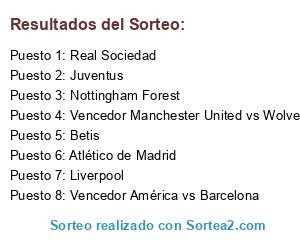 Lista de participantes: Vencedor Manchester United vs Wolves, Liverpool, Vencedor América vs Barcelona, Nottingham Forest, Atlético de Madrid, Juventus, Betis, Real Sociedad.