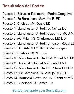 Lista de participantes: Chelsea V. van Dijk DFC, Manchester United R. Lewandowski DC, Fc Barcelona M. ter Stegen POR, Arsenal B. Saka ED MD, Arsenal M. Ødegaard MC, Arsenal Gabriel DFC, Fc Barcelona J. Musiala MCO MI MC, AC Milan M. Maignan POR, Chelsea V. Osimhen, Fc Barcelona Pedri MC EI, Fc Barcelona J. Kounde LD DFC, Fc Barcelona F. de Jong MC MCD, Arsenal Bremer DFC, Borussia Dortmund G. Kobel POR, Borussia Dortmund L. Modric MC MCO MCD, AC Milan P. Dybala MCO DC, Fc Barcelona Raphinha ED EI MD, AC Milan K. Kvaratskhelia, Fc Barcelona R. Araujo DFC LD, Chelsea M. Caicedo MCD, Borussia Dortmund N. Schlotterbeck DFC, Arsenal Bruno Guimaraes, Arsenal David Raya POR, Chelsea G. Mamardashvili, AC Milan Cristiano Ronaldo, Borussia Dortmund N. Kanté, Borussia Dortmund R. Mahrez, AC Milan C. Pulisic ED MD EI, Arsenal B. White LD, Arsenal Mikel Merino MC MCO, AC Milan S. Guirassy DC, Manchester United A. Onana POR, FC BARCELONA D. Kulusevski, Chelsea X. Simons, Borussia Dortmund Pedro Gonçalves, Fc Barcelona Lamine Yamal ED EI, AC Milan T. Reijnders MC MCD MCO, Fc Barcelona B. Kamara MCD MC, Manchester United M. de Ligt DFC, FC BARCELONA Marc Cucurella LI, AC Milan A. Christensen DFC MCD, Arsenal A. Dovbyk DC, Manchester United L. Martinez DFC, Arsenal L. Trossard EI DC, Manchester United L. Torreira, Chelsea K. Koulibaly, Borussia Dortmund M. Sabitzer MC MCO MCD, Borussia Dortmund G. Di Lorenzo LD DFC, Arsenal T. Partey MCD MC LD, Arsenal Sancet, Arsenal M. Diaby, Borussia Dortmund Y. En-Nesyri, Fc Barcelona Savinho EI ED, Fc Barcelona Balde LI LD MI, AC Milan Brahim MCO ED EI, Chelsea E. Fernandez MC MCD, Fc Barcelona J. David, Borussia Dortmund D. Udogie, Arsenal Gabriel Martinelli EI MI, Manchester United D. Nuñez DC, Arsenal P. Hincapie DFC LI, Chelsea R. James LD, Manchester United Diogo Dalot LI LD, AC Milan F. Tomori DFC, AC Milan J. Grealish EI MI, Borussia Dortmund D. Zapata, AC Milan A. Robinson, Fc Barcelona F. Kadıoğlu, Chelsea Joao Felix MCO MI DC, Manchester United A. Saint-Maximin, AC Milan Y. Fofana MCD MC, Manchester United N. Mazraoui LD LI, Manchester United Casemiro MCD MC, Arsenal Gabriel Jesus DC, Borussia Dortmund W. Anton DFC, Borussia Dortmund N. Süle DFC LD, Chelsea B. Henrichs, FC BARCELONA Jorginho MCD MC, Chelsea M. Gusto LD, Borussia Dortmund F. Nmecha MCD MC, AC Milan S. Chukwueze MD ED, Manchester United L. Shaw LI DFC, Manchester United H. Maguire DFC, Arsenal Javi Galan LI MI, Chelsea T. Kleindienst, Borussia Dortmund J. Gittens EI MI, Arsenal J. Musso POR, Manchester United Amad ED MCO MD, Chelsea L. Colwill DFC, Chelsea N. Madueke MD, Chelsea Pedro Neto MD MI, AC Milan M. Thiaw DFC, Chelsea W. Fofana DFC, Borussia Dortmund J. Ryerson LD LI, AC Milan Robert Sanchez POR, AC Milan D. Calabria LD, Borussia Dortmund R. Bensebaini LI DFC, Arsenal R. Sterling MI MD, Chelsea Alejandro Garnacho EI MI MD, Borussia Dortmund M. Beier DC MD ED, Chelsea R. Lavia MCD MC, Manchester United M. Mount MC MCO, Fc Barcelona Eric Garcia DFC MCD LD, AC Milan M. Gabbia DFC, FC BARCELONA B. Verbruggen, Manchester United R. Højlund DC, AC Milan T. Abraham DC, Manchester United Hugo Duro, Fc Barcelona A. Hložek, Manchester United A. Bayındır POR, Manchester United Emerson Royal LD DFC, Chelsea M. Sportiello POR, Manchester United Luis Rioja, AC Milan A. Florenzi LD LI, Borussia Dortmund A. Meyer POR, Fc Barcelona Pau Cubarsi DFC, Manchester United Y. Musah MC MCD MD.