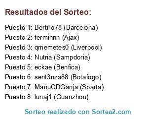 Lista de participantes: ManuCDGanja (Sparta), ferminnn (Ajax), lunaj1 (Guanzhou), Bertillo78 (Barcelona), eckae (Benfica), Nutria (Sampdoria), sent3nza88 (Botafogo), qmemetes0 (Liverpool).