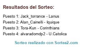 Lista de participantes: Alan_Cainelli - Iquique, Jack_torrance - Lanus, Tora-Kun - Corinthians, alvaradomdp2 - U.Catolica.