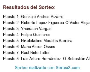 Lista de participantes: Yhonatan Vargas, Raul Brito Tatter, Gonzalo Andres Pizarro, Felipe Quinteros, Nikolokolino Morales Barrera, Mario Alexis Osses, Roberto Lopez Figueroa O Victor Alejandro Torres, Luis Arturo Hernàndez O Sebastián Alonso Faus.