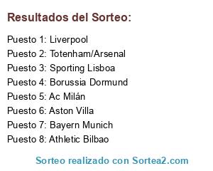 Lista de participantes: Totenham/Arsenal, Borussia Dormund, Sporting Lisboa, Aston Villa, Ac Milán, Liverpool, Bayern Munich, Athletic Bilbao.