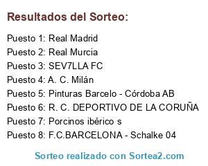 Lista de participantes: SEV7LLA FC, R. C. DEPORTIVO DE LA CORUÑA, Real Madrid, Real Murcia, F.C.BARCELONA - Schalke 04, Porcinos ibérico s, Pinturas Barcelo - Córdoba AB, A. C. Milán.