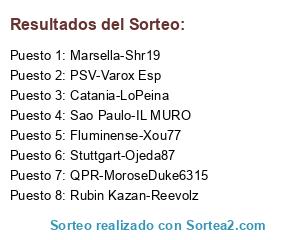 Lista de participantes: Fluminense-Xou77, Stuttgart-Ojeda87, Sao Paulo-IL MURO, Catania-LoPeina, QPR-MoroseDuke6315, PSV-Varox Esp, Rubin Kazan-Reevolz, Marsella-Shr19.
