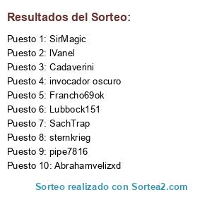 Lista de participantes: Abrahamvelizxd, Adrosar, Agata Aion, Alejandro506am, Astrid Samantha, B0mbsite, Bebépankeke, BETTLEBOT, BirdySB, burnmydread, Cadaverini, Daiki Shadow, dantecraft, deadslayer, Dem0nchain, DonJerRito, Draven Time, Dream Bunny, Driuss, ExtranguladoR, Francho69ok, frank1224, gJOOW, Horaizun, invocador oscuro, Josefyah, Javierlml, KeiberUzc, KelvinAyden, killler 5, LithyN, lluvia08, Lord fares, Lubbock151, lVanel, MEMOXD570, mrk8m, my dulc3 yh, necro king 18, otakulig, OverlordRage, oz666, Pamu, Patote69, pipe7816, SachTrap, SAKURACLUSMY, Senpai Carries U, Sentimel, SirMagic, SKT KurapInSec, slacker94, Slarkoner, srsid, sternkrieg, Stubbier, the enterrador, TheAkiriRave, Thejormungand, urielanyel, VektorG7, Wolf Star, xDualBlade, Xfyex, Xxkillua07xX, xXMINIJHXx, XxmormineitorxX, yulesekai, ZeloZalis, zero mxx.