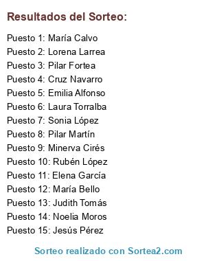 Lista de participantes: Cruz Navarro, Elena García, María Bello, Pilar Fortea, Sonia López, María Calvo, Rubén López, Laura Torralba, Emilia Alfonso, Jesús Pérez, Minerva Cirés, Judith Tomás, Lorena Larrea, Noelia Moros, Pilar Martín.