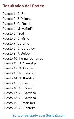 Lista de participantes: G. Rossi, R. Palacio, Fernando Torres, D. Berbatov, O. Cardosa, J. Martínez, C. Benteke, O. Cardozo, O. Giroud, D. Ba, Jonas, D. Sturridge, Llorente, Fred, B. Gomis, D. Milito, S. Kießling, B. Yılmaz, M. Vučinić, J. Defoe.