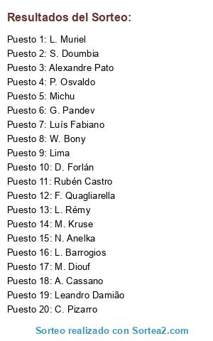 Lista de participantes: C. Pizarro, L. Barrogios, L. Muriel, W. Bony, S. Doumbia, Lima, Alexandre Pato, P. Osvaldo, Michu, F. Quagliarella, G. Pandev, Luís Fabiano, Rubén Castro, D. Forlán, A. Cassano, N. Anelka, Leandro Damião, M. Diouf, M. Kruse, L. Rémy.
