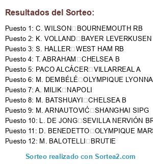 Lista de participantes: D. BENEDETTO OLYMPIQUE MARSEILLE, M. BATSHUAYI CHELSEA B, M. ARNAUTOVIĆ SHANGHAI SIPG, PACO ALCÁCER VILLARREAL A, M. BALOTELLI BRUTIE, M. DEMBÉLÉ OLYMPIQUE LYONNAIS, L. DE JONG SEVILLA NERVIÓN BR, C. WILSON BOURNEMOUTH RB, S. HALLER WEST HAM RB, A. MILIK NAPOLI, K. VOLLAND BAYER LEVERKUSEN, T. ABRAHAM CHELSEA B.