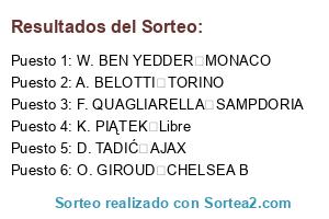 Lista de participantes: F. QUAGLIARELLA SAMPDORIA, W. BEN YEDDER MONACO, D. TADIĆ AJAX, O. GIROUD CHELSEA B, A. BELOTTI TORINO, K. PIĄTEK Libre.