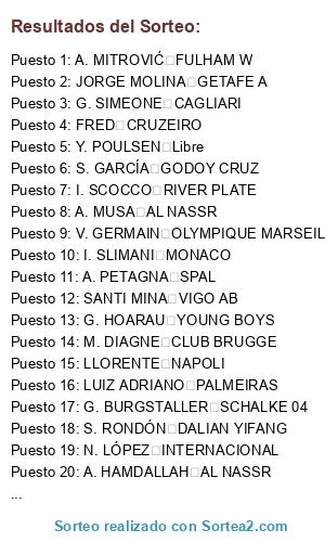 Lista de participantes: A. PETAGNA SPAL, LUCAS PÉREZ ÁLAVA AB, J. SAND LANÚS, N. LÓPEZ INTERNACIONAL, L. GAMBA ROSARIO CENTRAL, DJANINY AL AHLI, G. SIMEONE CAGLIARI, I. SCOCCO RIVER PLATE, DEULOFEU WATFORD BY, MATA GETAFE A, I. SLIMANI MONACO, M. DABBUR Libre, LLORENTE NAPOLI, G. HOARAU YOUNG BOYS, B. EMBOLO Libre, DYEGO SOUSA BENFICA, A. MITROVIĆ FULHAM W, M. KEAN EVERTON B, LUIZ ADRIANO PALMEIRAS, TIQUINHO SOARES PORTO, V. GERMAIN OLYMPIQUE MARSEILLE, ZÉ LUÍS PORTO, A. HAMDALLAH AL NASSR, N. JØRGENSEN FEYENOORD, G. BURGSTALLER SCHALKE 04, N. KALINIĆ ROMA, G. LABORDE MONTPELLIER, R. ÁBILA BOCA JUNIORS, MUNIR SEVILLA NERVIÓN BR, M. DIAGNE CLUB BRUGGE, S. GARCÍA GODOY CRUZ, RAÚL DE TOMÁS LLOBREGAT AB, SANTI MINA VIGO AB, FRED CRUZEIRO, A. DELORT MONTPELLIER, S. RONDÓN DALIAN YIFANG, O. AL SOMA AL AHLI, Y. POULSEN Libre, V. OSIMHEN LILLE, JORGE MOLINA GETAFE A, A. MUSA AL NASSR.