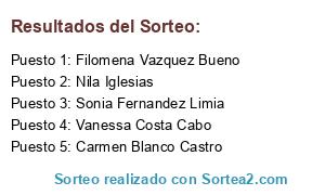 Lista de participantes: Amaya Sesar Conde , Maria Cruz De La Fuente , Nati Iglesias , Chabeli Villaverde , Ana Costa Fuentes , Patru Barorreidri Roguez , Cristina Otero , Nuria Brey Montaña , Encina Balo García , Begoña Rodriguez Pena , Patry Santorum Mato , Natalia Lopez , Mila Ramos Rey , Mariza ML , Cristina Nieto Abades , Veronica Camanzo , Ana Fernandez Lopez , Sole CB , Alborada Creaciones Fimo , Teresa López , Rosalia Novoa Diaz , Conchita González Osorio , Filomena Vazquez Bueno , Dolores Tato Rey , Paula Rozas Álvarez , Pily Grela Feijoo , Sonia Fernandez Limia , Mercedes Costa R , Begoña Castro Villaverde , Ana Maria Gonzalez Lopez , Maria Mdo Bdo , Pilar Brea Ramos , Marta Regalade , Loli Garcia Troitiño , Beatriz González Fernández , Carmen Blanco Castro , Jose Antonio Dobarro Zobra , Victoria Cachafeiro Vidal , Otilia Rodriguez , Mercedes Soto , Rocio Souto Presedo , Renata Rosa , Esther Guerra Lobato , Pepa Nóvoa Dièguez , Anxos García Fidalgo , Monica Maceira Giadanes , Monika Sánchez Seijo , Cris Fdez Barros , Mónica Alcaide Britos , Maite Zaitut , Peluqueria Esther Bandeira-silleda , Nila Iglesias , Rosa Rodriguez , Alex Carvalho Fraiz , Vanessa Costa Cabo , @seguros_deza_mgs , @monikaseijo , @sandra_sbrea , @monicae1123 , @bochuiah , @parafarmacia_farmaofficiale , @laurula , @mii_ire , @antiapev , @marizamontoto , @leyla.lenceria , @singuladerm_galicia , @salahmanolo.