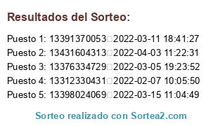 Este sorteo ha sido certificado por Sortea2. Sortea2 garantiza que: